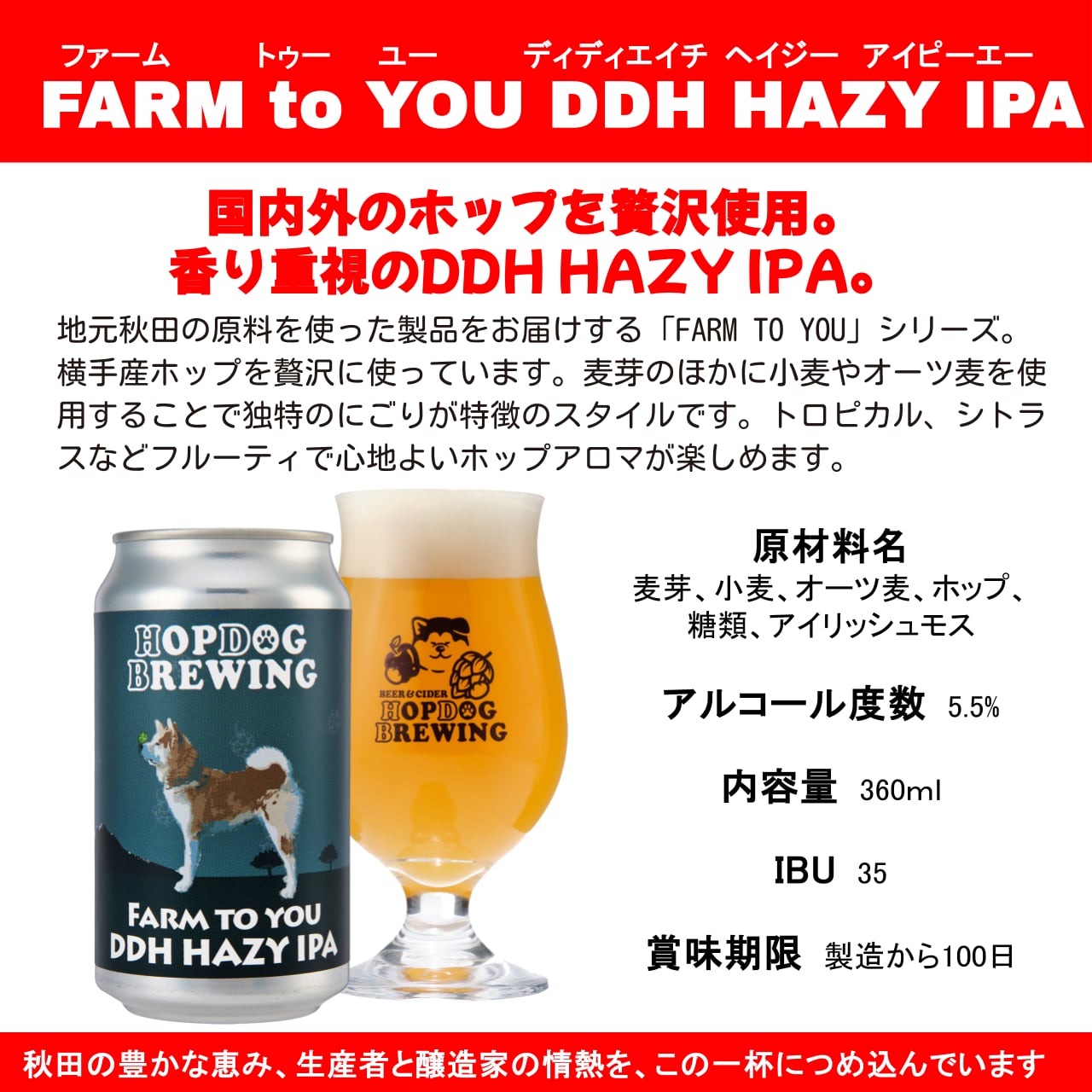 秋田県横手産ホップ、アメリカ産ホップなど贅沢に使用した、香り重視のDDH HAZY IPAです。